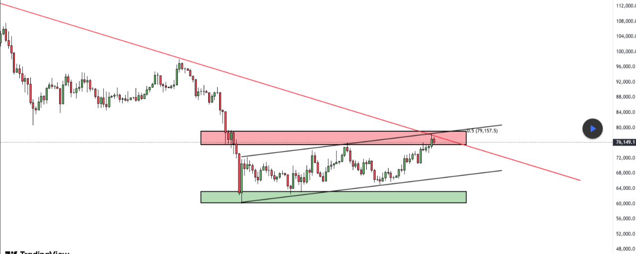 If BTC manages to print a strong daily candle above the $80,000 psychological barrier and the red trendline, it would signal a massive structural shift.
