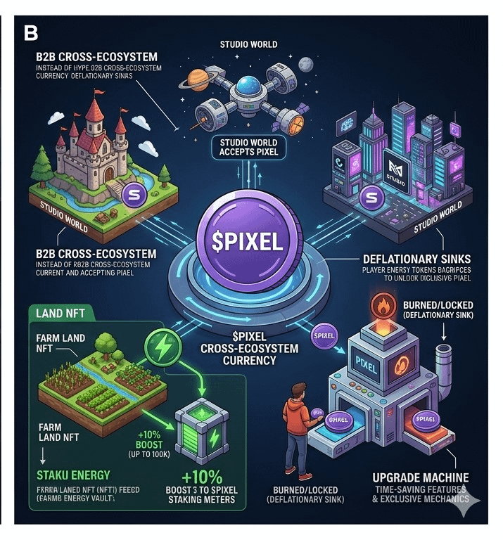 Weźmy jeszcze jeden prosty przykład: jak w dużym parku tematycznym kupujesz VIP fast-pass za dodatkowe pieniądze, aby uniknąć długiej kolejki, tak samo w uniwersum Pixels gracze muszą wydać swoje $PIXEL , aby zaoszczędzić czas, uzyskać premium ulepszenia i odblokować ekskluzywne mechaniki w grze. A kiedy wydają, inteligentny kontrakt automatycznie spala lub blokuje ten token, zamiast go zwracać do podaży.