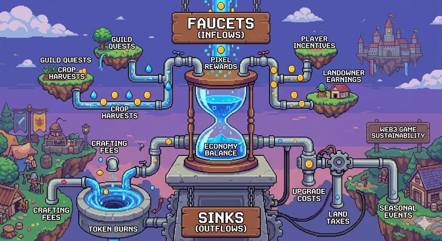 At its core, this model explains why many Web3 game economies struggle while a few manage to sustain themselves. Faucets are all the points where tokens or resources enter the ecosystem—PIXEL rewards from quests, crops producing tradable outputs, and incentives tied to player activity. Sinks are the mechanisms through which value leaves the system, such as upgrade costs, crafting fees, land taxes, and token burns. A stable economy depends on both operating in balance. Excessive faucets create inflation and weaken reward value, while too many sinks can frustrate players and reduce participation. Maintaining this balance is not a one-time task; it requires continuous adjustment as player numbers and market conditions evolve.