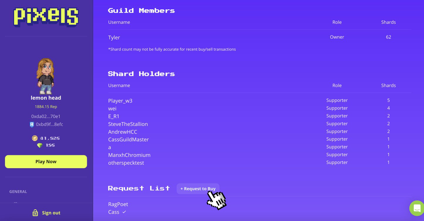 Guild Shard prices follow a bonding curve. As more Shards are bought, their price will increase. For example, the first Shard will cost 1 $PIXEL—the next, 2 $PIXEL, and so on.