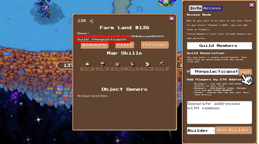 Farm Land Associations: Landowners can associate their NFT Farm Land to a Guild. This information is visible on the Guild's dashboard page.