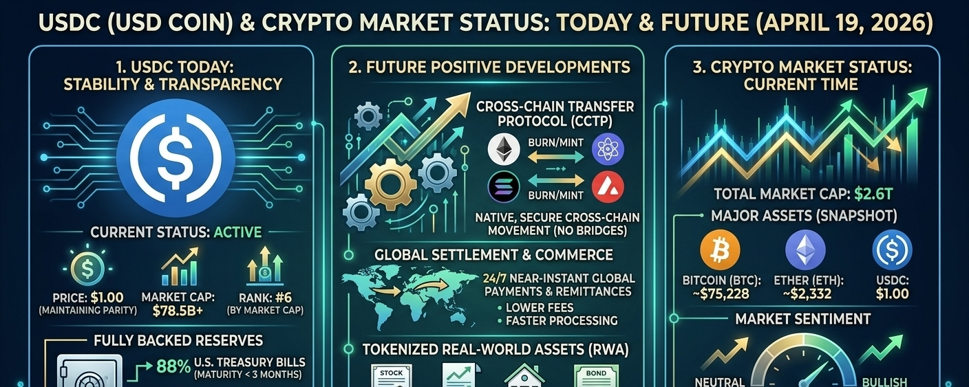 As of April 19, 2026, USDC has moved beyond being just a "trading pair" and is now functioning as the primary infrastructure for global digital finance. The current situation and outlook are as follows: 1. Today’s Market Status: April 19, 2026