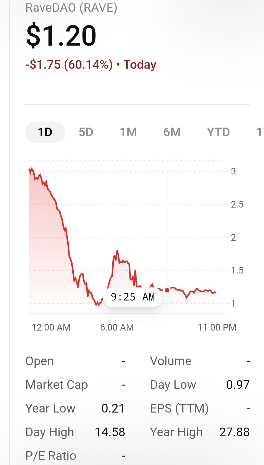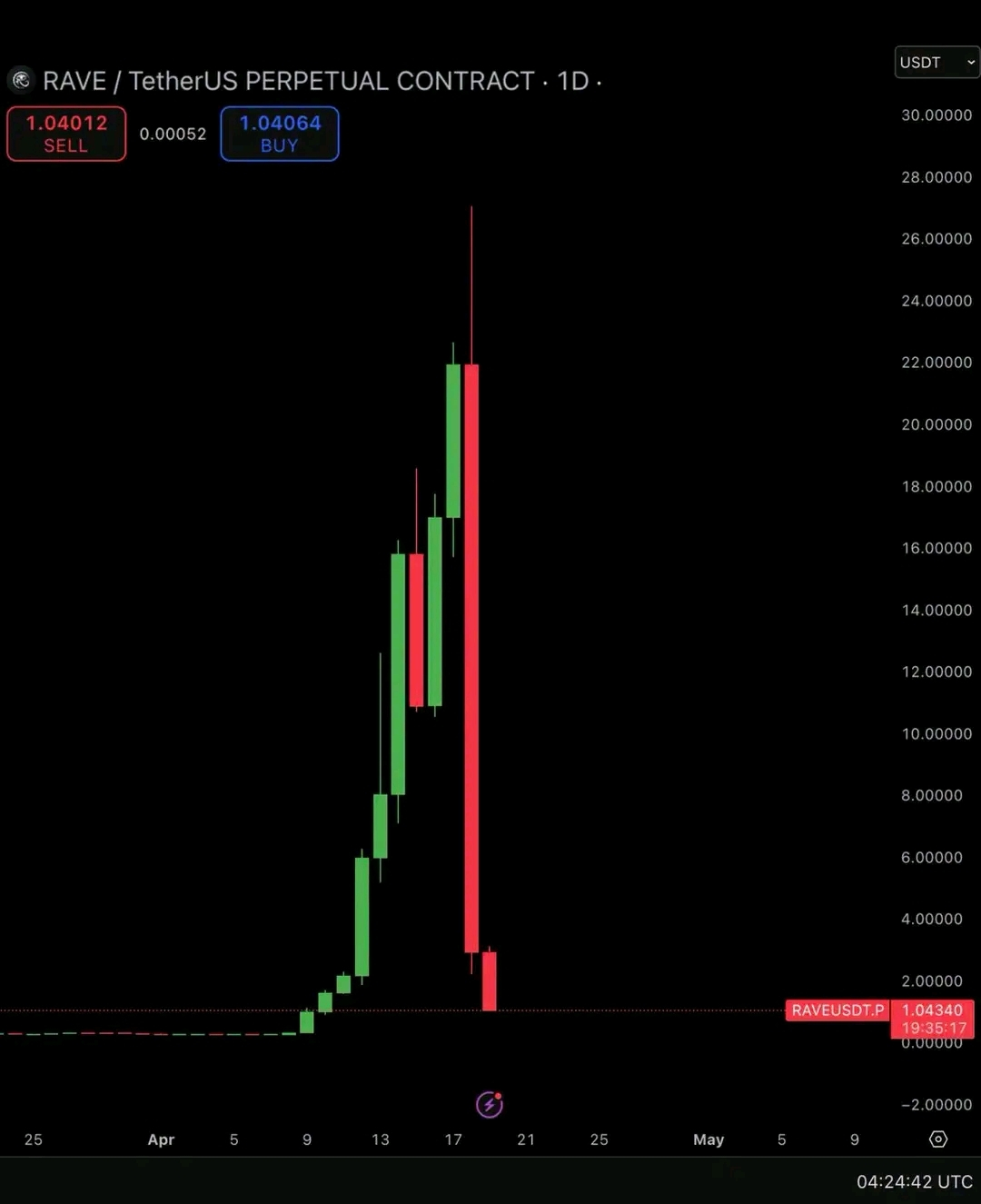 W mniej niż 24 godziny $RAVE spadł z 28 dolarów do niemal 1 dolara, zmazując około 6,5 miliarda dolarów w kapitalizacji rynkowej. Taki drastyczny ruch jest rzadkością nawet w kryptowalutach, gdzie ostre korekty są powszechne.