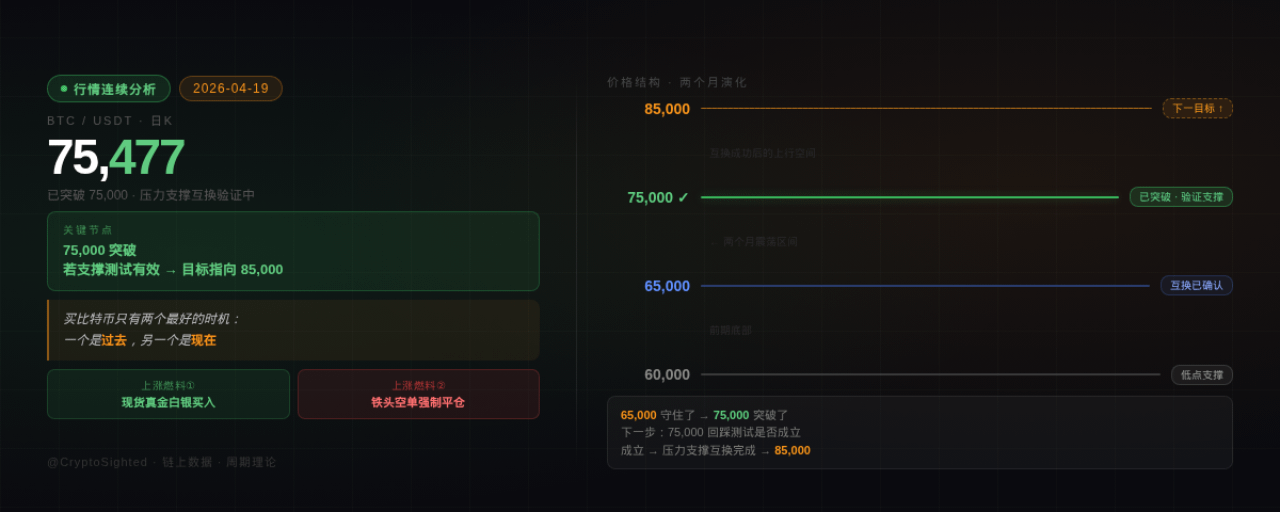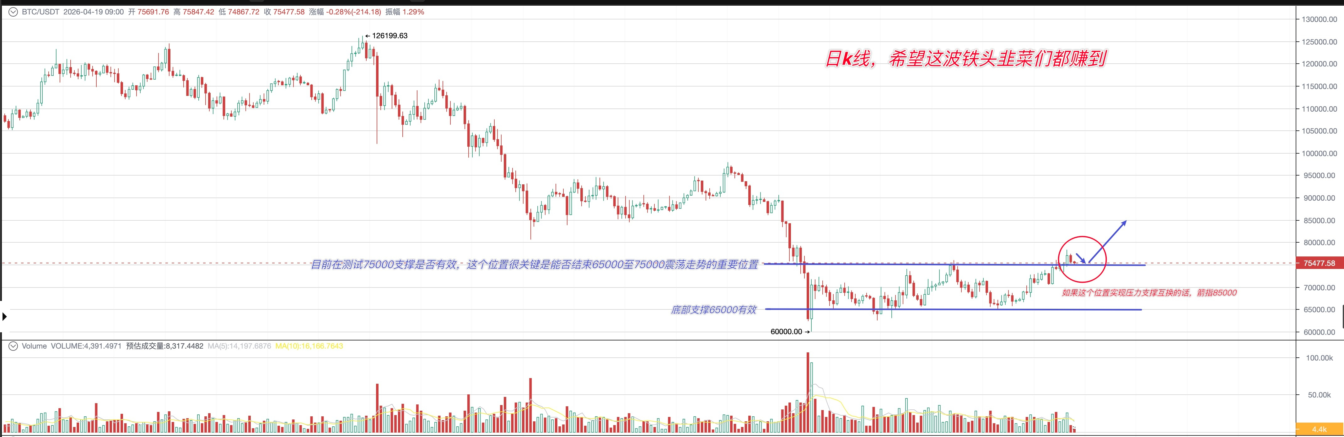 截至今天(4月19日),$BTC 日K收在75477,站上了75000这条线。