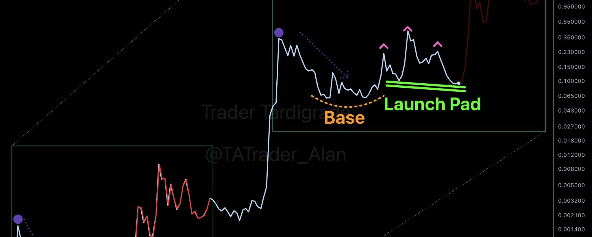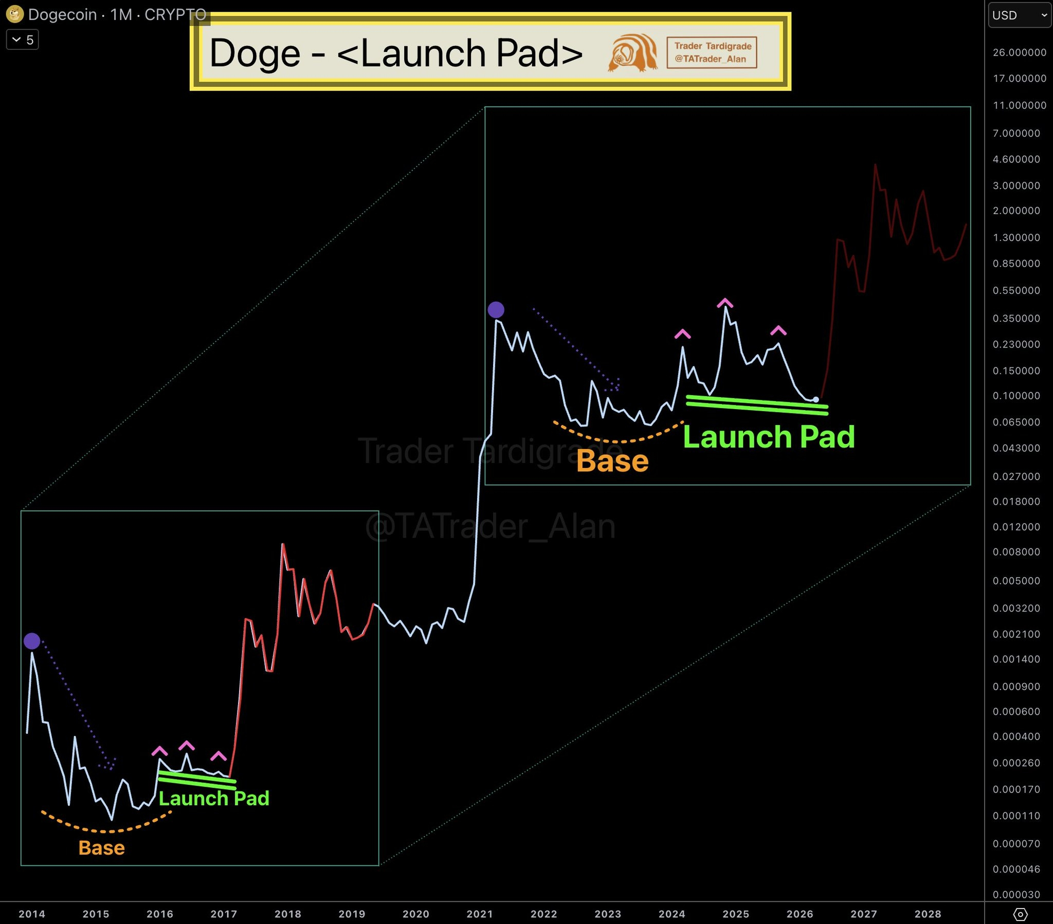 Miren bien la imagen que les traigo, familia. Estamos viendo el fractal de "Launch Pad" (Plataforma de Lanzamiento). ¿Ven esos cuadros? Entre 2014 y 2017, Doge se pasó años cocinándose en una base circular, como un plato hondo, acumulando energía. Nadie daba un peso por él, hasta que tocó esa línea verde de soporte y ¡pum!, se fue a la luna. 📈