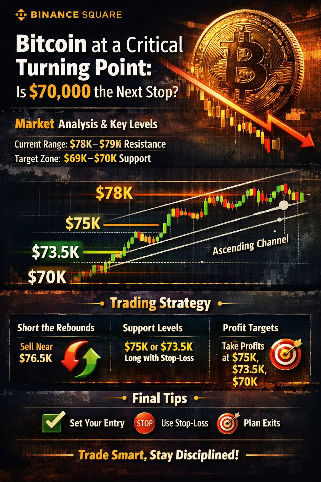 Dwa dni temu podkreśliliśmy, że Bitcoin handlował w ramach rosnącego kanału, z potencjalnym szczytem formującym się w okolicach strefy $78,000–$79,000. Jak przewidywano, ten poziom działał jako silny opór, a rynek zaczął się cofać.