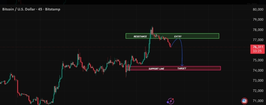 The marked entry area near resistance offers a favorable bearish setup, especially as price failed to break and hold above the resistance band. If sellers maintain control below 77,600, the bearish pressure is likely to continue, with the 74,000 region acting as the next major liquidity target.