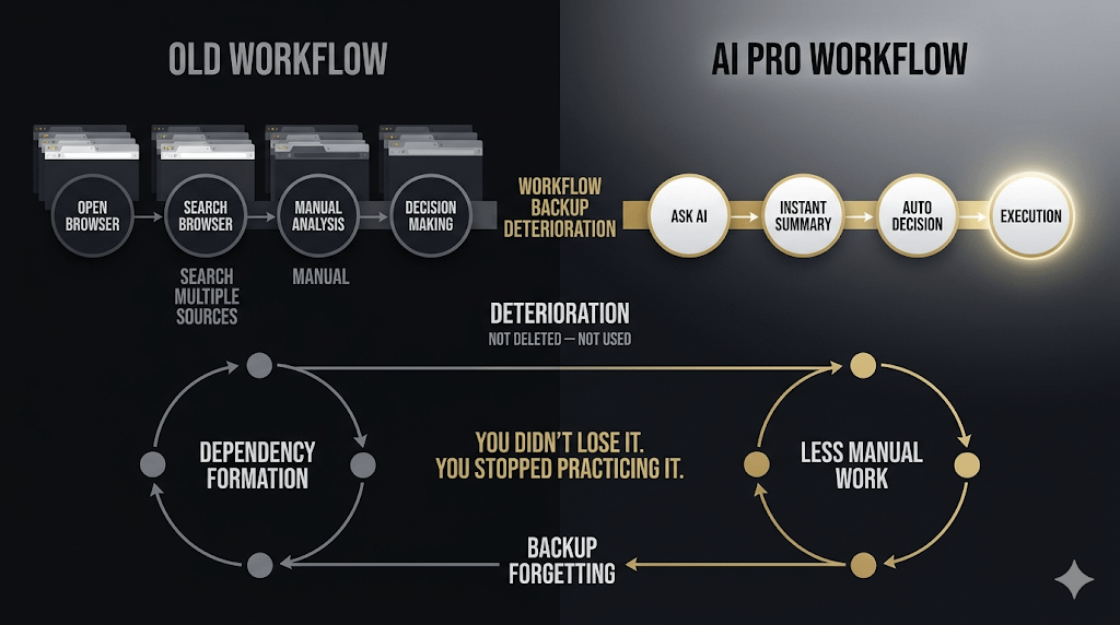 Nowy użytkownik, który został odrzucony, będzie sfrustrowany i będzie szukał ręcznie. Wciąż mają zapasowy workflow - jeszcze nie zdążyli go stracić. Użytkownik, który korzystał z AI Pro przez trzy miesiące, jest inny. Zapasy workflow nie są już dostępne w jego głowie. Musi odbudować od początku w rzeczywistym czasie, podczas gdy rynek się porusza.