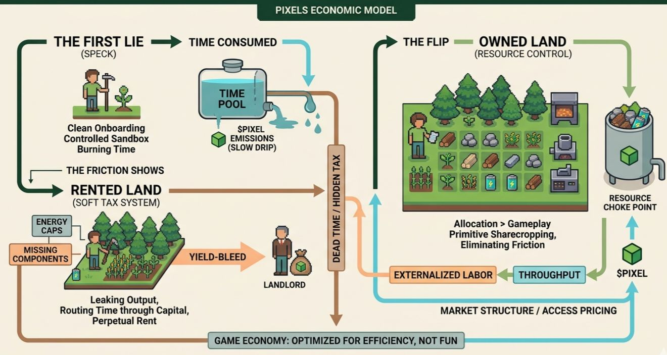 Energy caps. Missing inputs. Craft queues stalling because the one component you need lives behind someone else’s land tier. That’s when it clicks: the game isn’t starving you of rewards, it’s starving you of access. And access in Pixels is a priced asset.