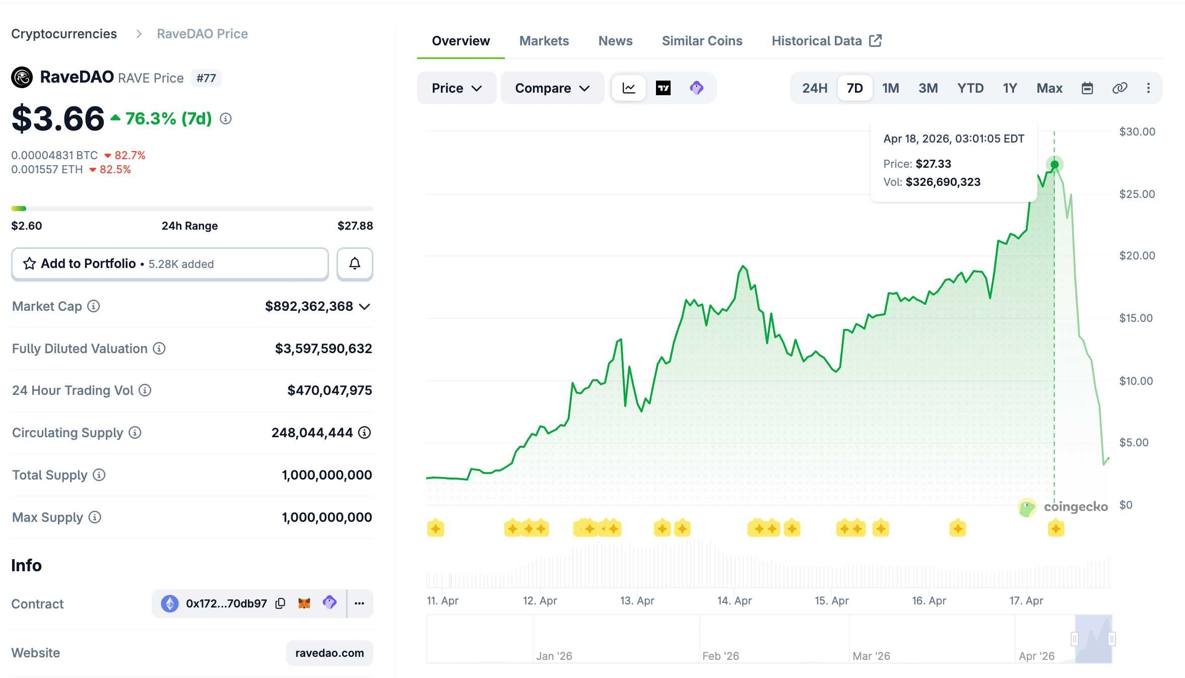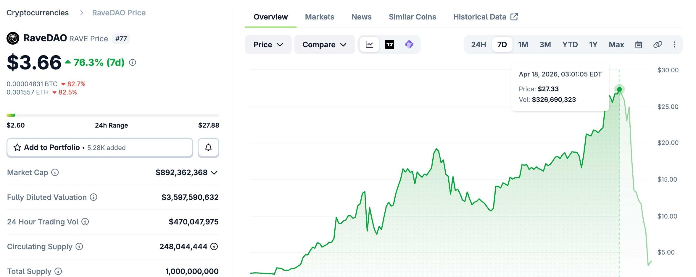 RAVE climbed from roughly $0.25 to a peak near $28 in about nine days, per CoinGecko data. At its high, the token briefly ranked around the top 20 by market cap, surpassing Litecoin and Avalanche. It has since retraced sharply, trading around $3.47 Saturday afternoon, down roughly 84% on the day and more than 87% from its peak. Its current market cap stands at about $892 million.