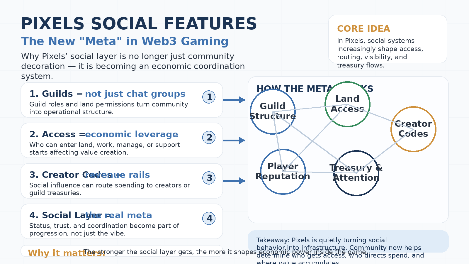 The more I look at it, the more its social layer stops looking like community garnish and starts looking like the actual meta. Not meta in the lazy “this is the trend” sense. I mean meta as the higher-order game sitting on top of farming, crafting, and progression. The part where relationships, access, reputation, and coordinated attention start affecting how value moves. In Pixels’ docs, the project is still explained through farming, exploration, skill progress, and social connections, but that social part carries more weight than it first seems. It has been part of the game’s identity from the start, not a later addition.That shift becomes obvious once you stop looking only at crops and start watching permissions.