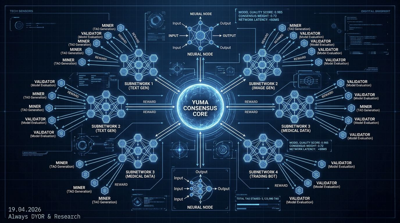 Mechanika tego ambitnego ekosystemu opiera się na unikalnej strukturze subnetworków (podsieci), z których każda dedykowana jest innemu zadaniu – od generowania tekstu, przez tworzenie obrazów, aż po analizę danych medycznych. Sercem on-chainowej gospodarki jest mechanizm konsensusu Yuma, który sprawiedliwie rozdziela nagrody w tokenach $TAO dla jednostek (Miners) dostarczających najbardziej wartościowe modele oraz walidatorów oceniających ich jakość. Mimo że Bittensor oferuje wysoką odporność na cenzurę, stabilność i precyzja odpowiedzi w tak rozległej sieci stanowią ciągłe wyzwanie techniczne, wymagające nieustannej kalibracji algorytmów oceniających. Projekt dąży do bycia zdecentralizowaną warstwą bazową dla AI, gdzie zamiast ufać jednej firmie, polegamy na matematycznie potwierdzonej jakości zbiorowej inteligencji, w której każda jednostka TAO reprezentuje udział w najpotężniejszym, otwartym systemie uczącym się na świecie.