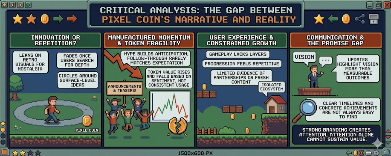 Moneta PIXEL sprzedaje obraz innowacji, ale to, co dostarcza, wydaje się bliższe powtórzeniu niż postępowi. Projekt opiera się na retro wizualizacjach, aby wzbudzić emocje, ale ta nostalgia szybko zanika, gdy użytkownicy szukają prawdziwej głębi. Zamiast ewoluować w dynamiczny ekosystem gier, często krąży wokół powierzchownych pomysłów, które nigdy nie dojrzewają w pełni.