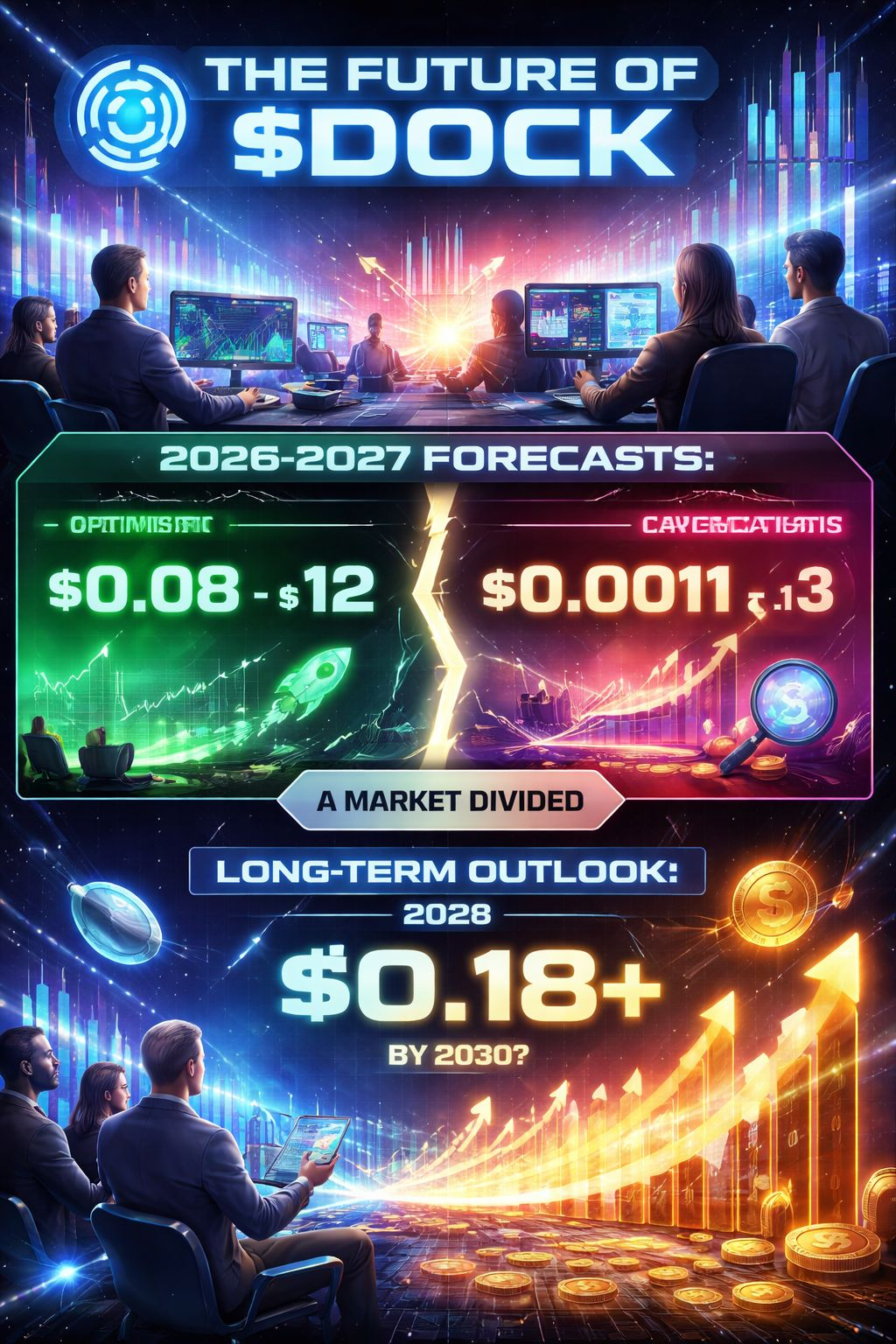 W przyszłości przewidywania dotyczące kryptowaluty $DOCK różnią się znacznie między optymistami a ostrożnymi optymistami. W latach 2026–2027 niektórzy analitycy przewidują, że wartość waluty osiągnie zakres między 0,08 USD a 0,12 USD, jeśli rynek będzie się rozwijał i wspierał małe projekty, podczas gdy inni przewidują, że pozostanie w zakresie 0,0011 USD do 0,0013 USD z powodu ograniczonego popytu lub niestabilnego rynku. W miarę zbliżania się końca dekady rośnie optymizm co do przyszłości waluty, gdyż niektóre prognozy przewidują, że wartość $DOCK przekroczy 0,18 USD do roku 2030, co odzwierciedla wiarę w zrównoważony rozwój projektu i ciągły wzrost w jego otoczeniu gospodarczym.