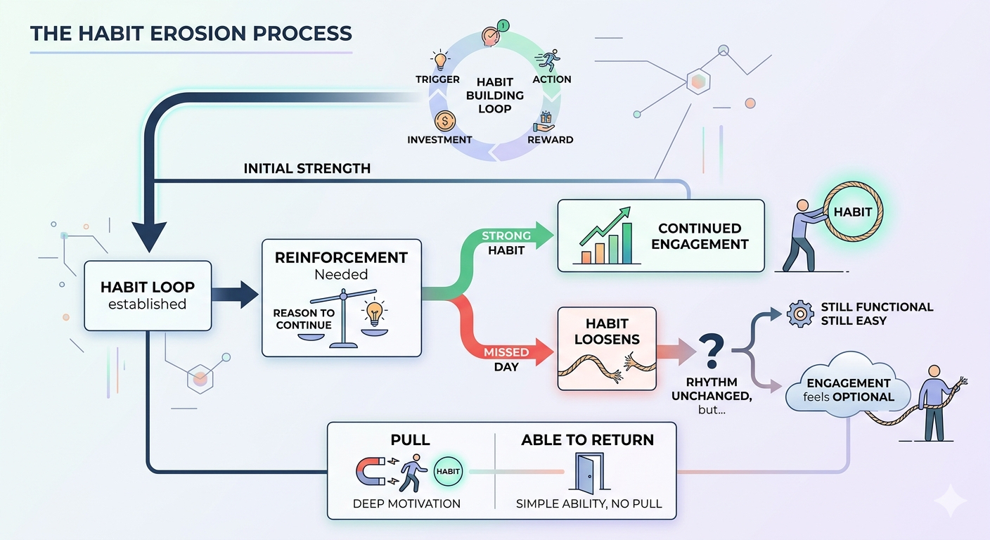 The system clearly knows how to build habit. That part works. But habits need reinforcement. They need a reason to continue beyond the initial loop. Otherwise they slowly loosen.