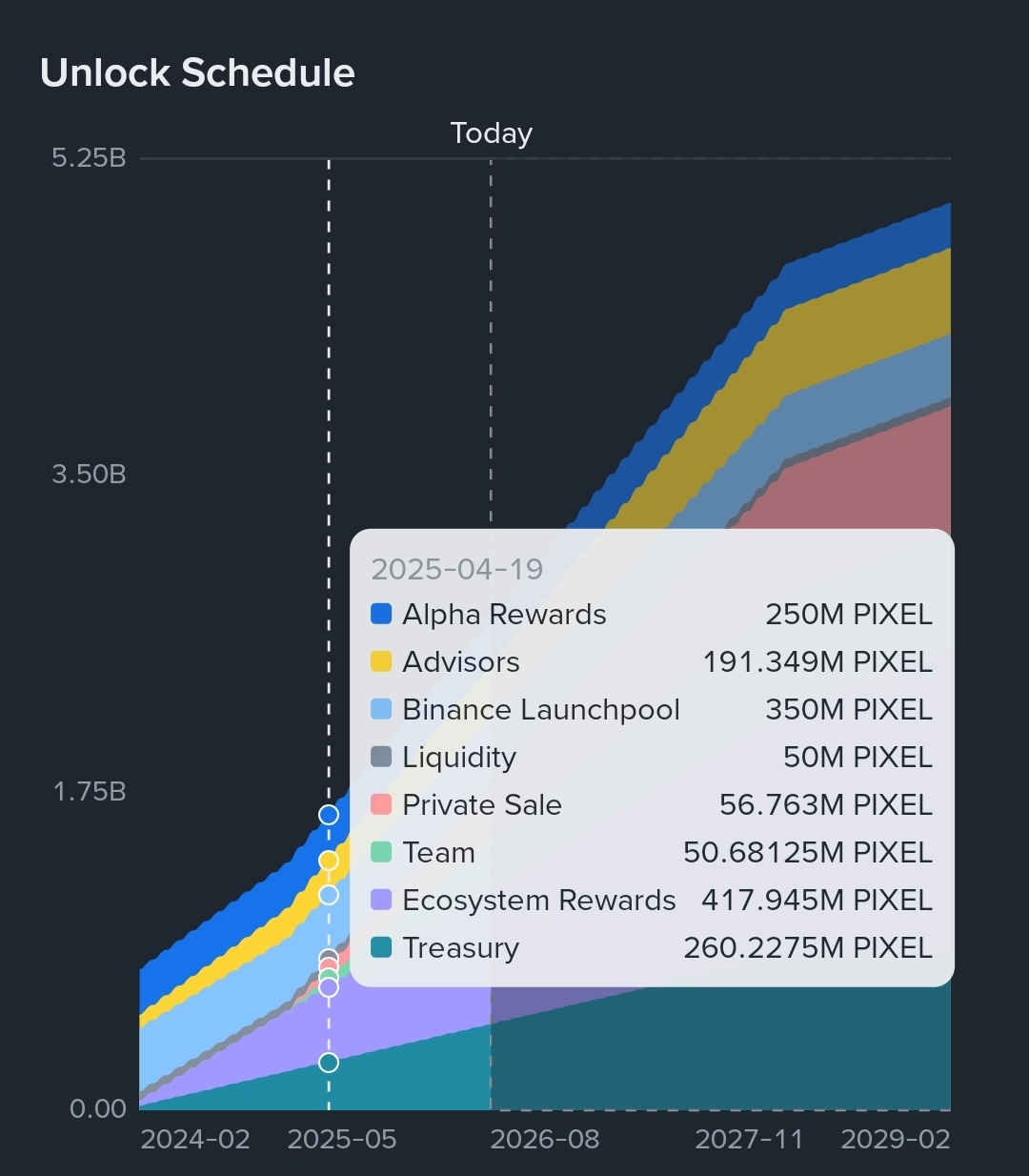 The chart extends toward 2029, with supply rising toward roughly 5.25B PIXEL. By 2025-04-19, several buckets had already reached meaningful size: 417.945M PIXEL for Ecosystem Rewards, 350M for Binance Launchpool, 260.2275M for Treasury, 250M for Alpha Rewards, 191.349M for Advisors, 56.763M for Private Sale, 50.68125M for Team, and 50M for Liquidity. Even just looking at those figures, my takeaway is simple: distribution quality matters more here than narrative quality.