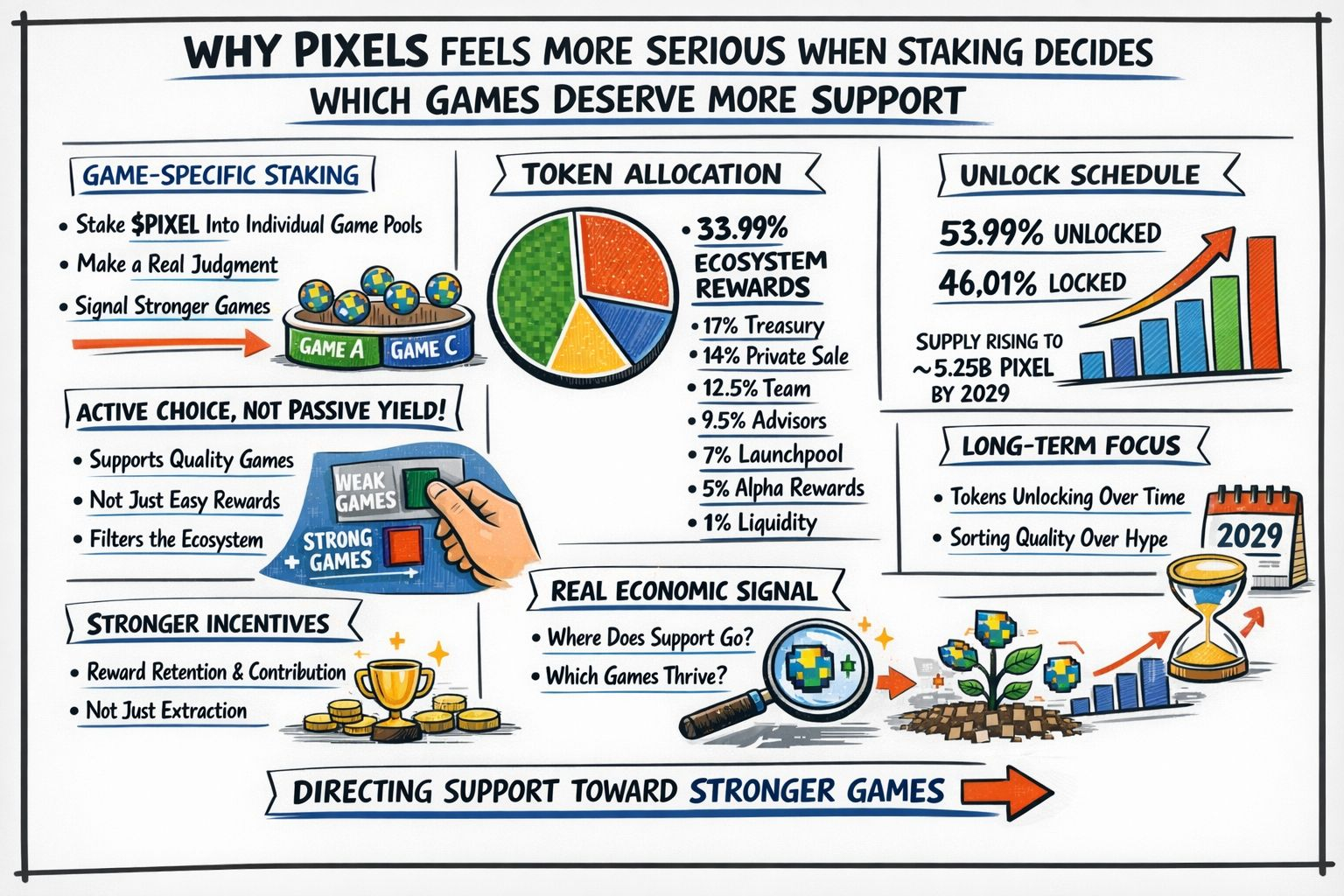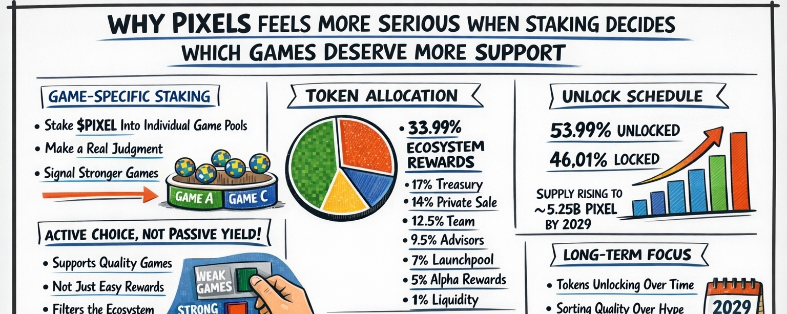 That is why my interest in Pixels is less about one trade and more about the logic underneath the system. I get more interested when a token stops acting like a passive reward machine and starts forcing an ecosystem to reveal what it actually values. In Pixels, the combination of a large ecosystem rewards bucket, a long unlock schedule, and game-specific staking pools all point to the same question: can this ecosystem direct more support toward the games that genuinely strengthen it?