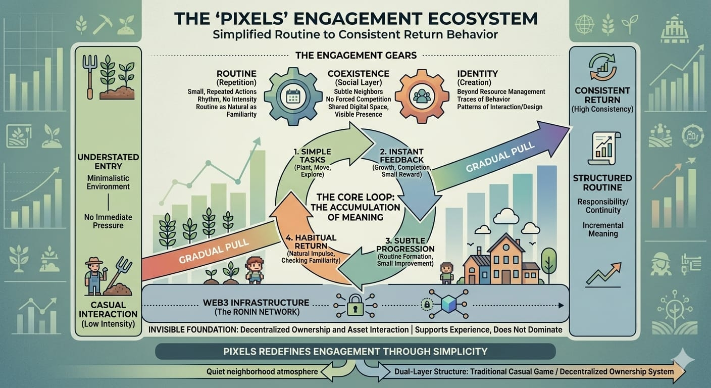 That shift—from random play to consistent behavior—is where the real strength of Pixels lies.