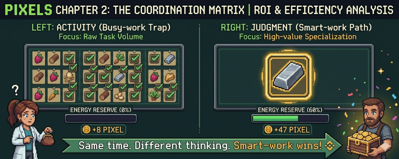 Think about what the Energy Floor concept actually means in practice. If your most efficient activity converts 1000 Energy into 50 $PIXEL, then every task that falls below that ratio is literally costing you money. You're not just "not earning" - you're destroying value. The game doesn't tell you this. You have to figure it out yourself.