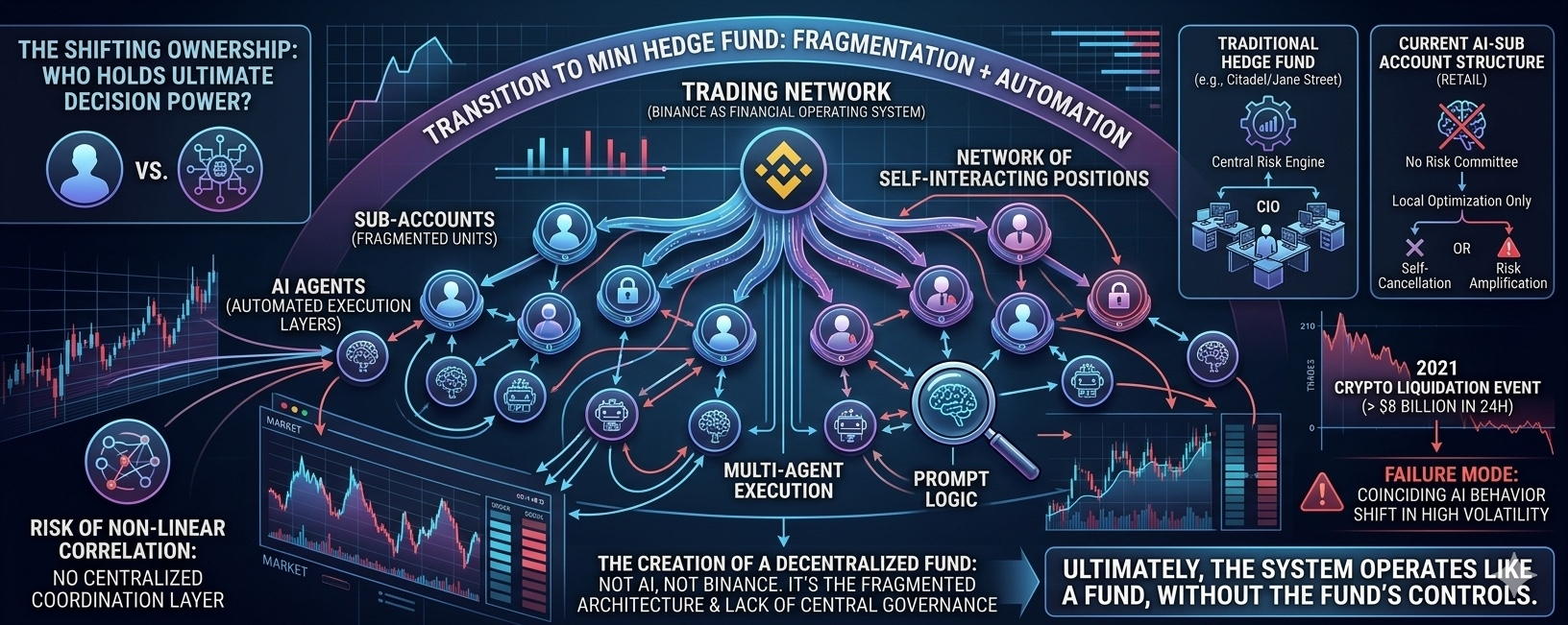 Mini hedge fund không được tạo ra bởi AI. Nó cũng không được tạo ra bởi Binance. Nó được tạo ra bởi chính kiến trúc phân mảnh quyền ra quyết định kết hợp với tự động hóa execution. Khi mỗi phần đều hợp lý riêng lẻ, nhưng hệ thống tổng thể lại không có người chịu trách nhiệm toàn cục.