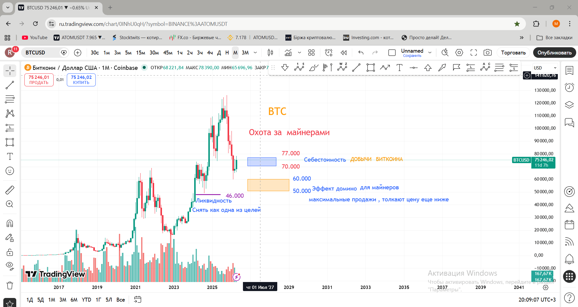 В диапазоне $70 000 мы уже увидели аномальные продажи не только биткоина, но и самого оборудования. Дальнейшее снижение цены вызовет эффект домино. Кроме того, на уровне $46 000 сосредоточен огромный пул ликвидности — а это всегда главная цель крупного игрока. При достижении этих отметок в майнинге выживут только сильнейшие. Рынок всё покажет.