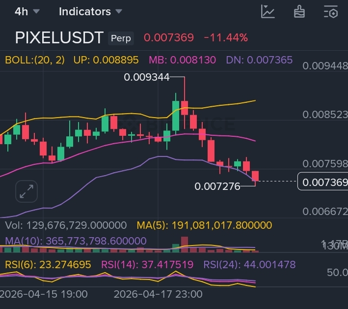 cena spadła do 0.007369 na 4H z -11.44%. od niedawnego szczytu 0.009344 sprzed kilku dni jesteśmy teraz prawie 21% niżej. DN Bollinger na 4H jest na poziomie 0.007365 — praktycznie dokładnie tam, gdzie obecnie się handluje. minimum dnia osiągnęło 0.007276.