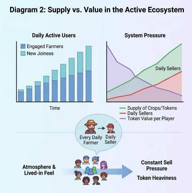But even that creates a contradiction. The same active player base that makes the world feel alive also creates constant economic pressure. Every engaged player farming daily adds supply. Every reward converted into something more stable creates selling pressure. The system produces its own sellers. That is why the token often feels heavy. The pressure is not coming from outsiders. It is coming from the players themselves.