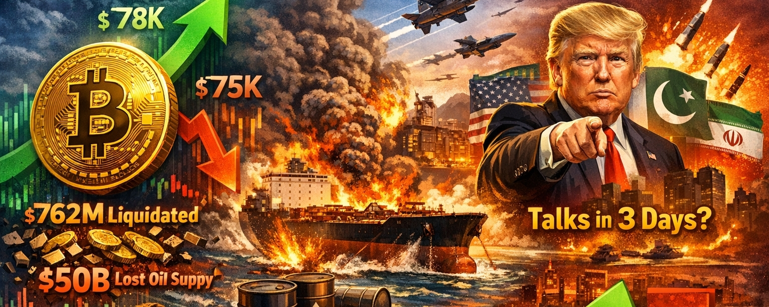 Tymczasowy sygnał otwarcia wokół Cieśniny Ormuz pomógł wypchnąć BTC powyżej 78 tys. dolarów, ale ruch szybko osłabł, gdy Iran ponownie przejął kontrolę nad szlakiem wodnym. Odwrócenie ściągnęło Bitcoina z powrotem w okolice 75 tys. dolarów i pomogło wywołać około 762 milionów dolarów w likwidacjach kryptowalut, przy czym krótkie pozycje poniosły największe straty.