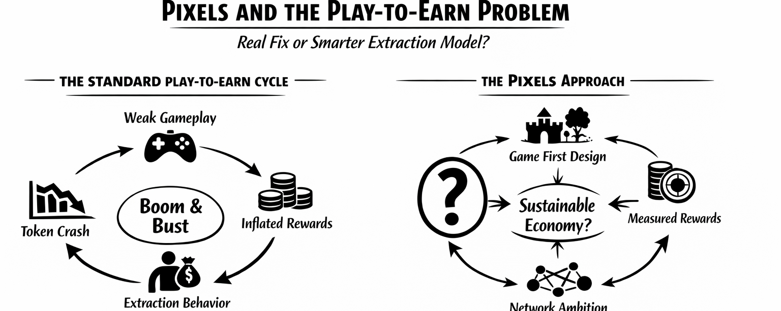 Ponieważ Pixels nie wchodzi na czysty rynek, gdzie ludzie wciąż są idealistyczni w sprawie modeli play-to-earn. Wchodzi w kategorię, która już spaliła wiele zaufania. Więc prawdziwe pytanie nie brzmi, czy Pixels wygląda lepiej niż najgorsze projekty z ostatniego cyklu. Wyraźnie tak. Prawdziwe pytanie brzmi, czy faktycznie rozwiązuje podstawowy problem, czy tylko pakuje ten sam model w sposób, który wydaje się bardziej dopracowany i bardziej zrównoważony na trochę dłużej.