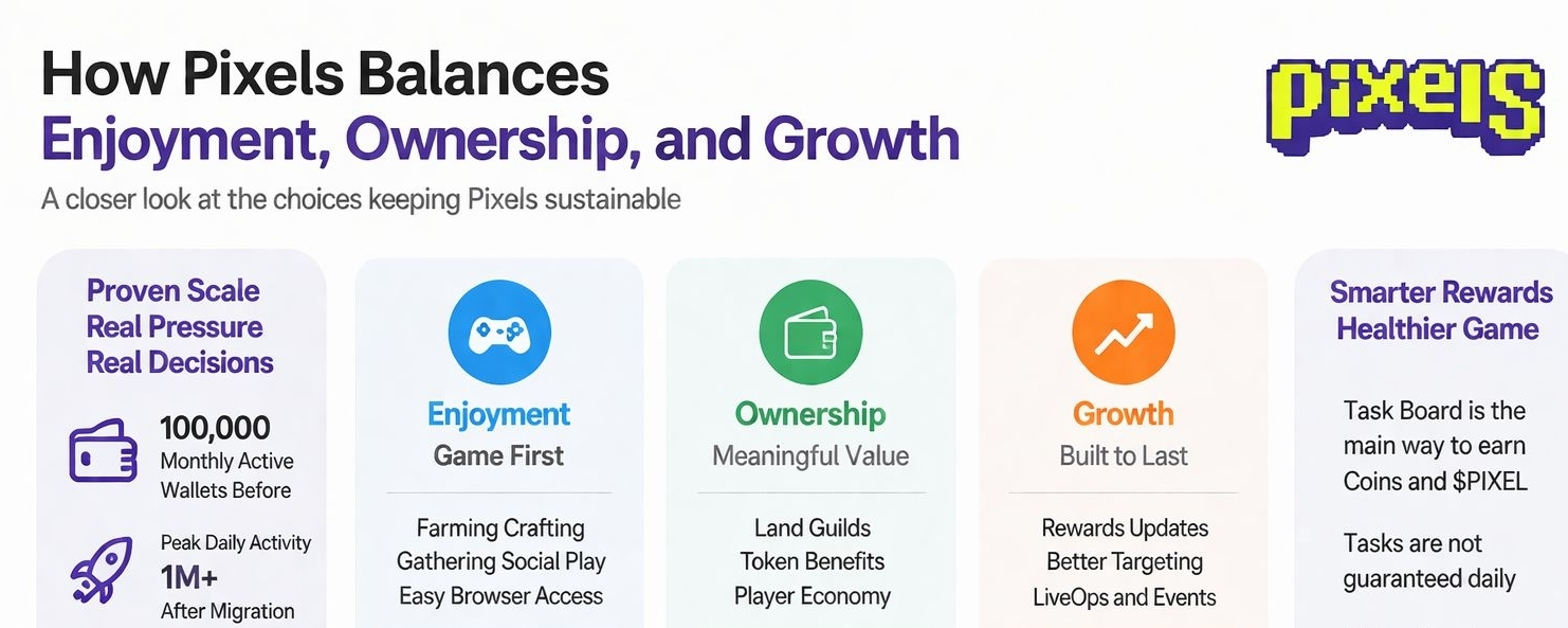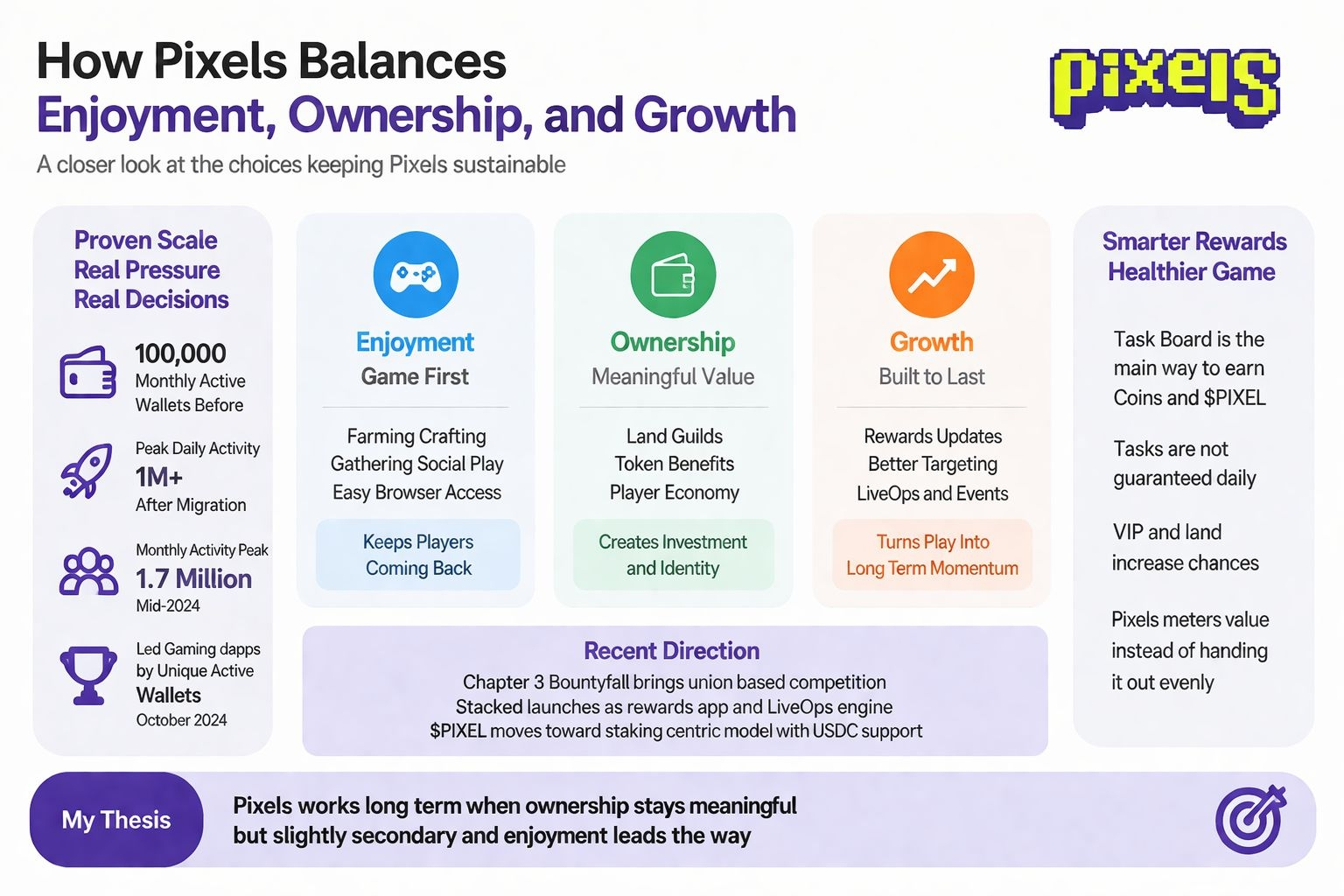 I find it helpful to look at Pixels as a balancing act between three promises that naturally pull against each other. Enjoyment comes from the everyday loop of farming crafting gathering social play and a browser game that is easy to enter. Ownership comes from the parts that can be held traded or amplified across the system especially land guild structures and token-linked benefits. Growth comes from rewards updates and the game’s ability to turn casual play into a reason to come back tomorrow. The clever part is that Pixels does not treat all three equally at every moment and the game’s current reward structure makes that clear. The Task Board is described by Pixels as the primary way to earn Coins and $PIXEL in game and it explicitly says that $PIXEL tasks are not guaranteed each day while VIP and land ownership can increase the chance of seeing them. That tells me Pixels is not trying to hand out value evenly because it is trying to meter it.