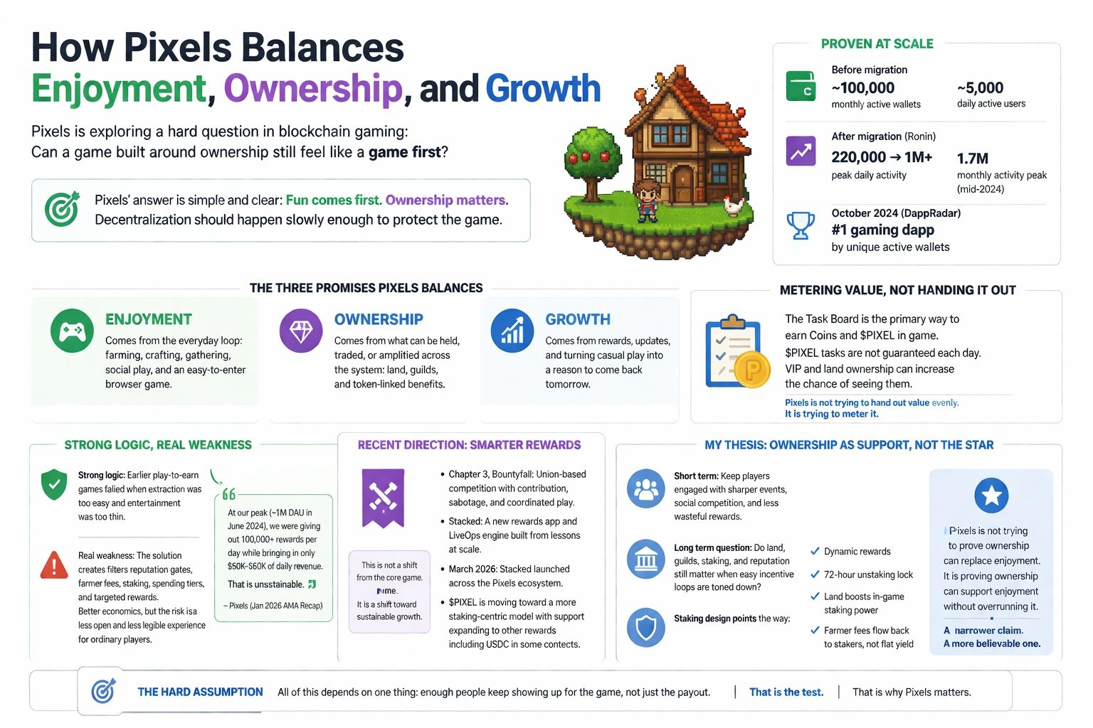 I keep coming back to Pixels because it forces a harder question than most blockchain games do and I am not really asking whether it can attract users for a season or whether its token can catch a narrative. What I keep asking instead is whether a game built around ownership can still feel like a game first. From the beginning Pixels framed its answer in unusually plain terms by saying that fun comes first while blockchain ownership matters and deeper decentralization should happen slowly enough that the product does not break under its own ideals.