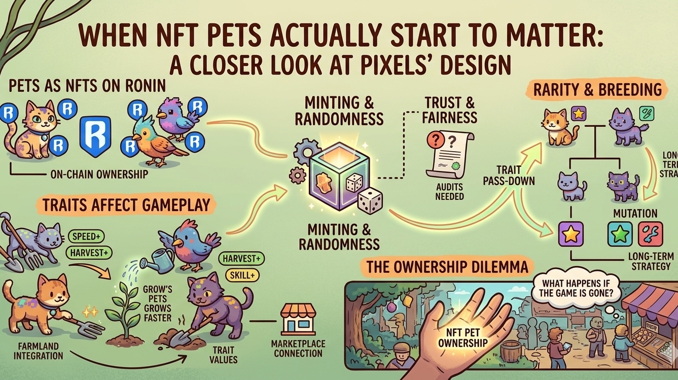 I didn’t expect much when I first started looking into Pixels’ pet system. If you’ve seen one NFT collection, you’ve seen most of them—traits get generated, combinations are randomized, everything gets minted on-chain, and the word “unique” gets thrown around like it means something deeper than visual variation. It’s a formula that’s been repeated so many times that it’s hard not to approach new projects with a bit of skepticism. That mindset stuck with me here, and honestly, I still think it’s the right starting point. But as I dug a little deeper, I realized there’s at least an attempt to push beyond that surface-level approach, even if it’s too early to say how well it will hold up over time.