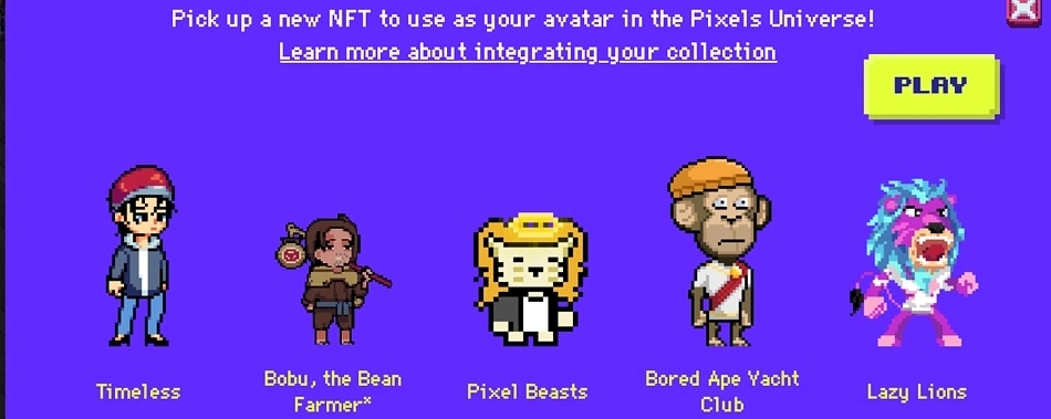 Pixels supports over 80 external NFT collections as playable in-game avatars, including collections like Pudgy Penguins, Bored Ape Yacht Club, Lazy Lions and Mocaverse. The game does not sell these avatars. It interoperates with them, meaning if you already own one of those NFTs, you can simply bring it into the Pixels world and play as it.