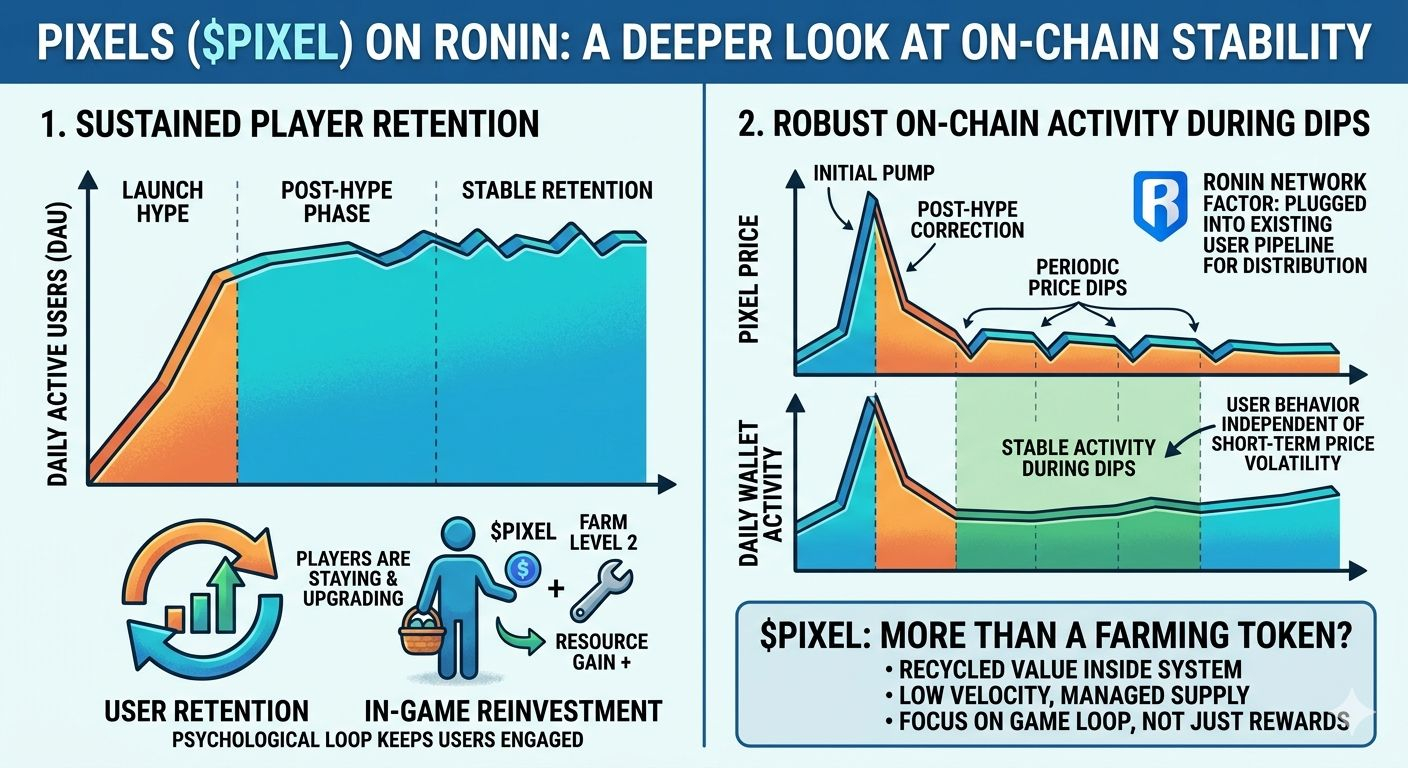 If I was posting this with proof, I’d attach a screenshot showing Ronin daily active users next to the $PIXEL price chart, highlighting how user activity stays stable even when price isn’t pumping. That kind of visual tells the whole story without needing hype words.