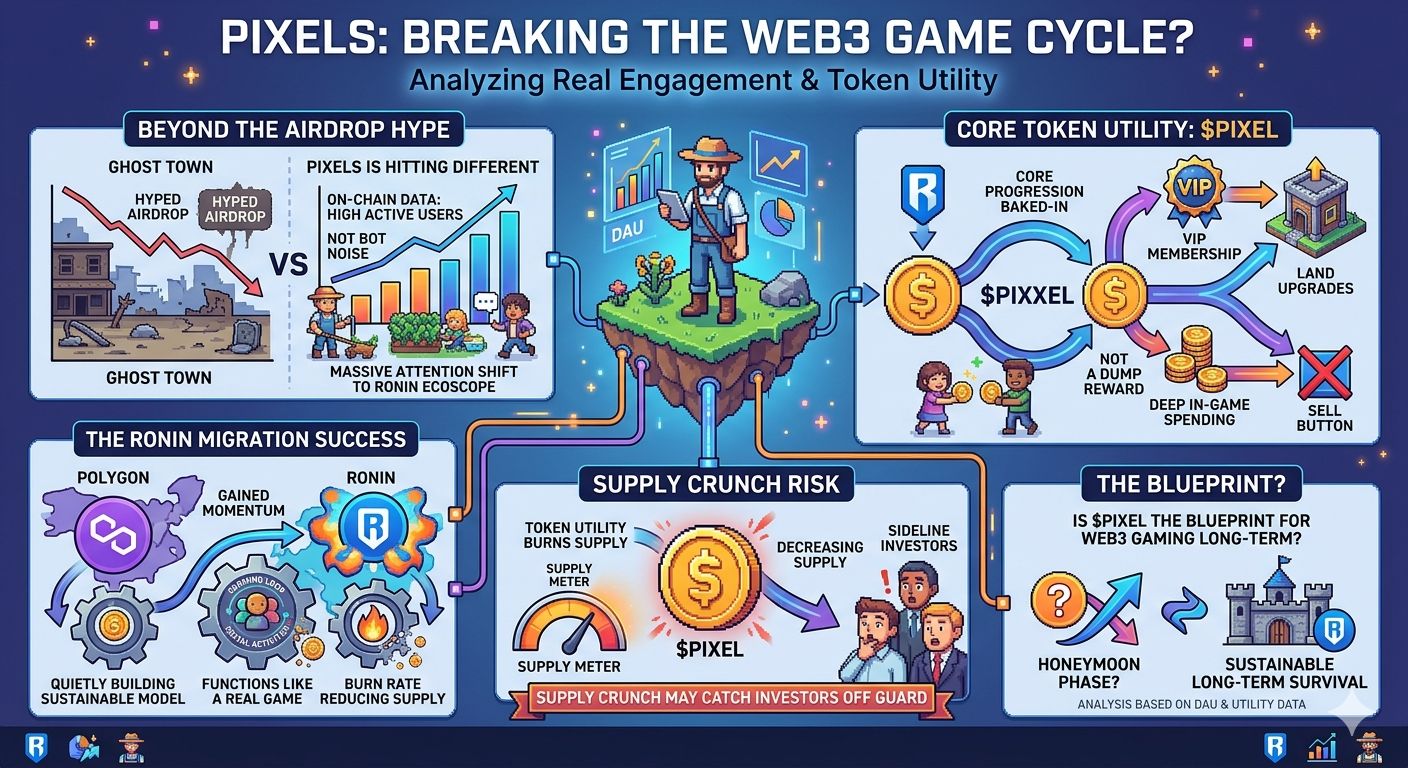 I’ve been watching the activity on the Ronin Network for a while now, and Pixels keeps popping up in a different way. It’s not driven by sudden hype or influencer noise. It’s quieter than that. But when you look closer, the numbers tell a different story. People are actually showing up daily. Not just to claim rewards and leave, but to stay, farm, trade, and interact. That kind of behavior is rare in GameFi, and honestly, it caught me off guard.