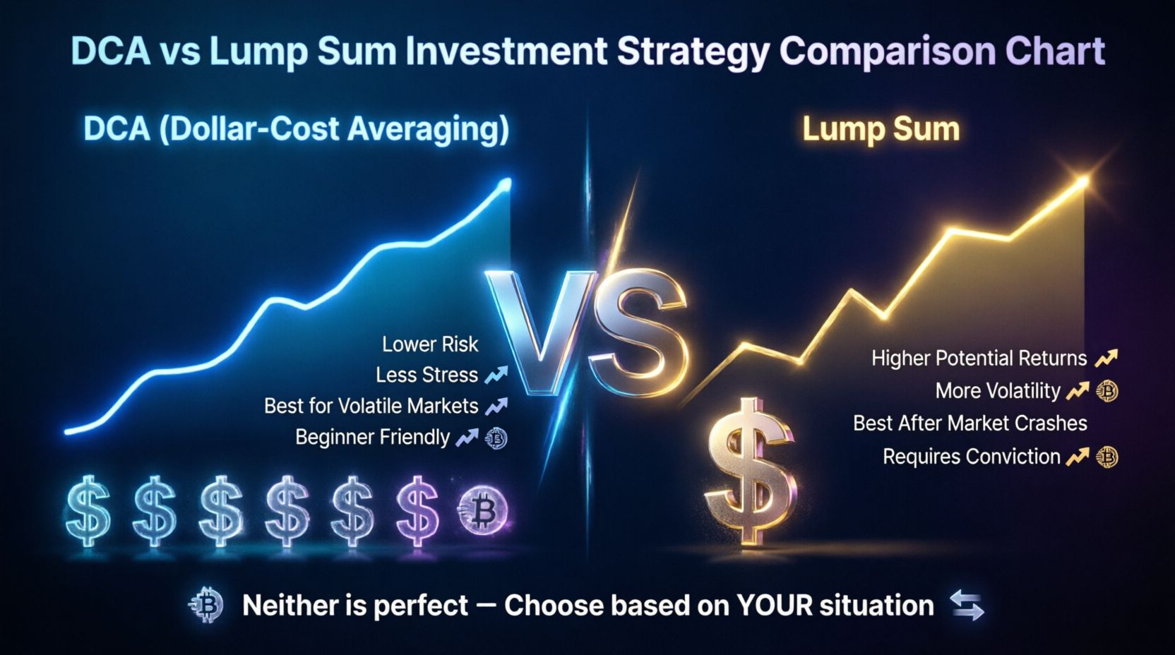 • 💡 Analogy: DCA = eating small meals throughout the day. Lump Sum = one big feast.