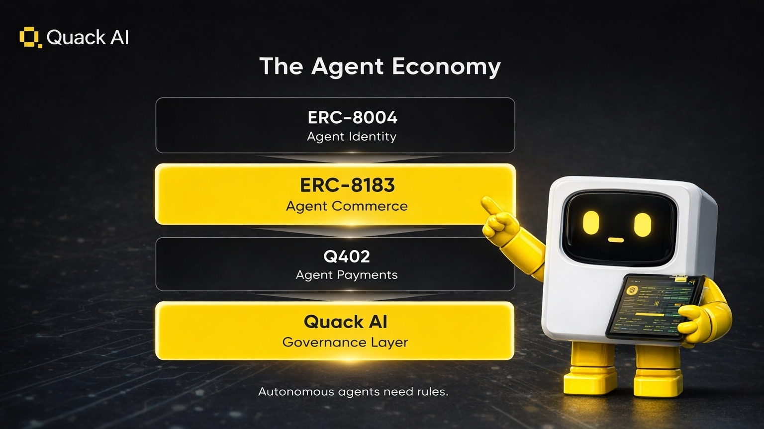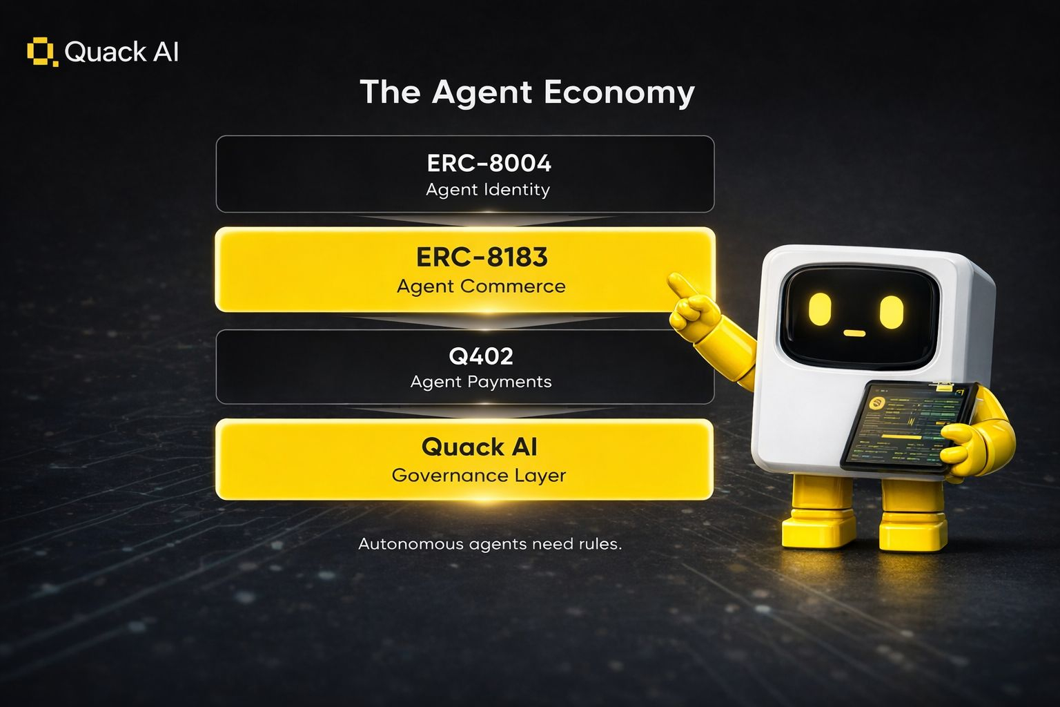 Quack AI is building the foundation of the Agent Economy, where intelligent agents can act, trade, and grow on their own. With ERC-8004, every agent has a clear identity. ERC-8183 unlocks seamless commerce between agents. Q402 enables fast and efficient payments.
