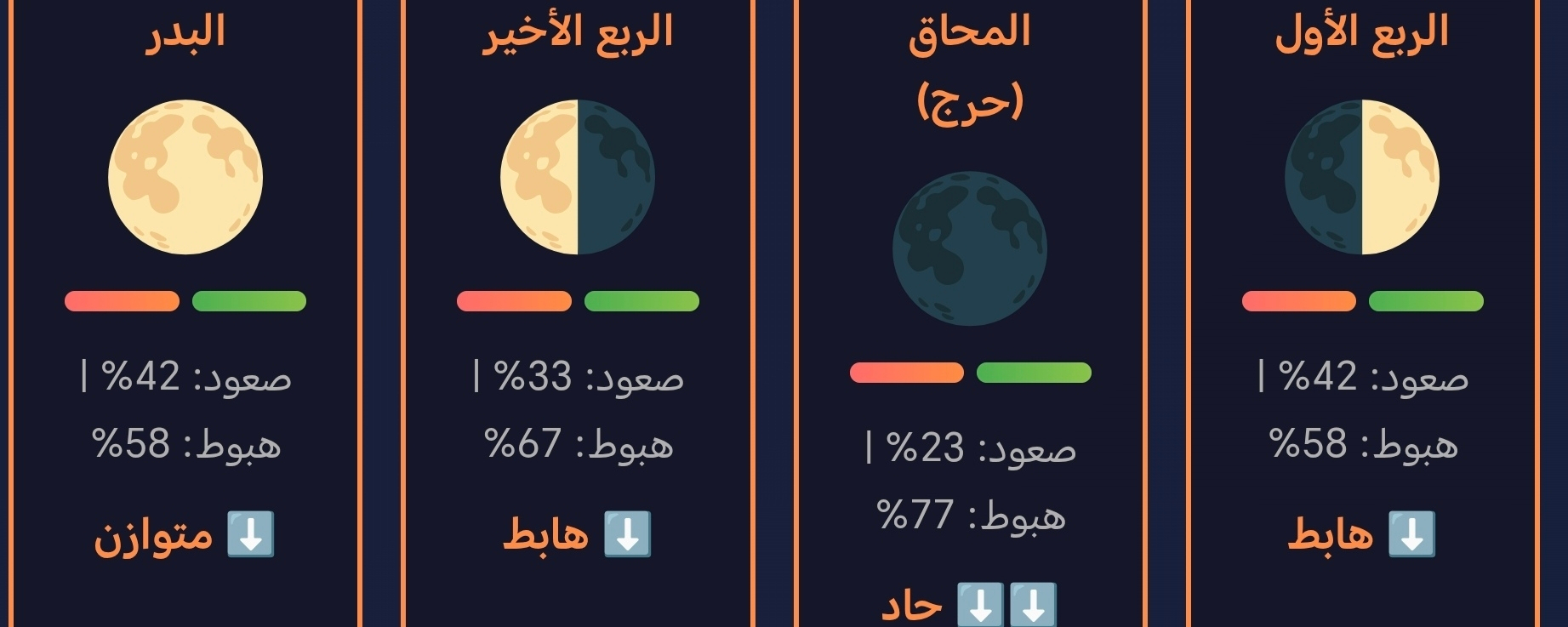 | **البدر** | 42% صعود / 58% هبوط | متوازن | قوي | هابط متوازن |