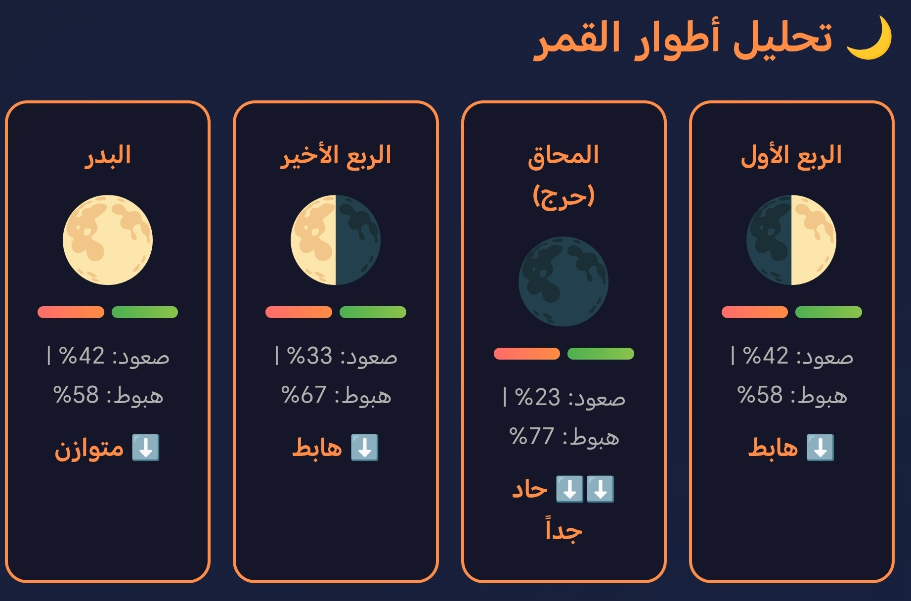 | **المحاق** | 23% صعود / 77% هبوط | ضعيف جداً | قوي جداً ✓✓ | هابط حاد |