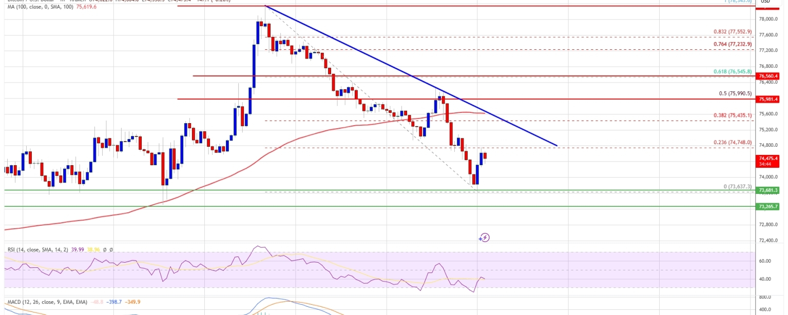 Zobacz, jak wygląda sytuacja: wiodąca moneta uderzyła w sufit na poziomie $78,350 i, nie znajdując siły, by go przełamać, zaczęła się ślizgać. 📉 Teraz operujemy poniżej $75,500 i słynnej średniej ruchomej z 100 godzin, co w prostych słowach oznacza, że "niedźwiedzie" (ci, którzy chcą, aby cena spadała) przejmują kontrolę nad sterem na chwilę. Powstało dno techniczne na poziomie $73,637 i tam jest prawdziwa okop; jeśli stracimy ten poziom, możemy zobaczyć, jak cena odwiedza $72,500 lub nawet $70,000, co jest naszą ostateczną czerwoną linią. 🚩