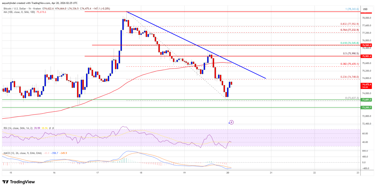Rodzino, trzymajcie się mocno, bo Bitcoin przypomniał nam, że w tym świecie nikt nie wznosi się do nieba w linii prostej! 🎢 Jeśli świętowałeś te $78,400 z kawą w ręku, informuję, że rynek postanowił dać nam kąpiel w rzeczywistości. BTC nie mógł utrzymać tempa na szczycie i wpadł w hamulec, co teraz sprawia, że walczy w błocie, starając się nie puścić znaku $73,500.