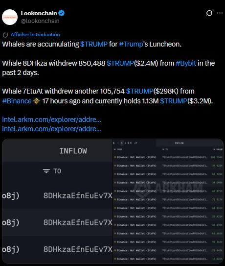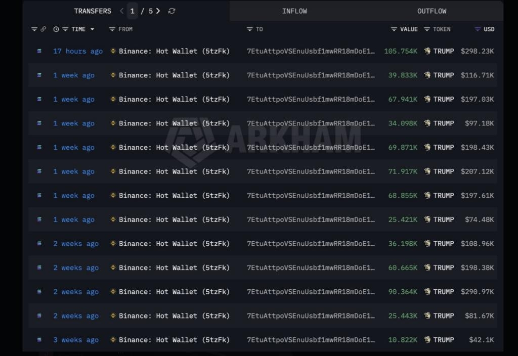 According to blockchain tracking reports, several large wallets recently withdrew major amounts of TRUMP tokens from exchanges such as Binance, Bybit, and BitMart. The buying rush appears linked to event access rules: only the top 297 holders reportedly receive invitations, while the top 29 wallets may gain access to an additional private reception.