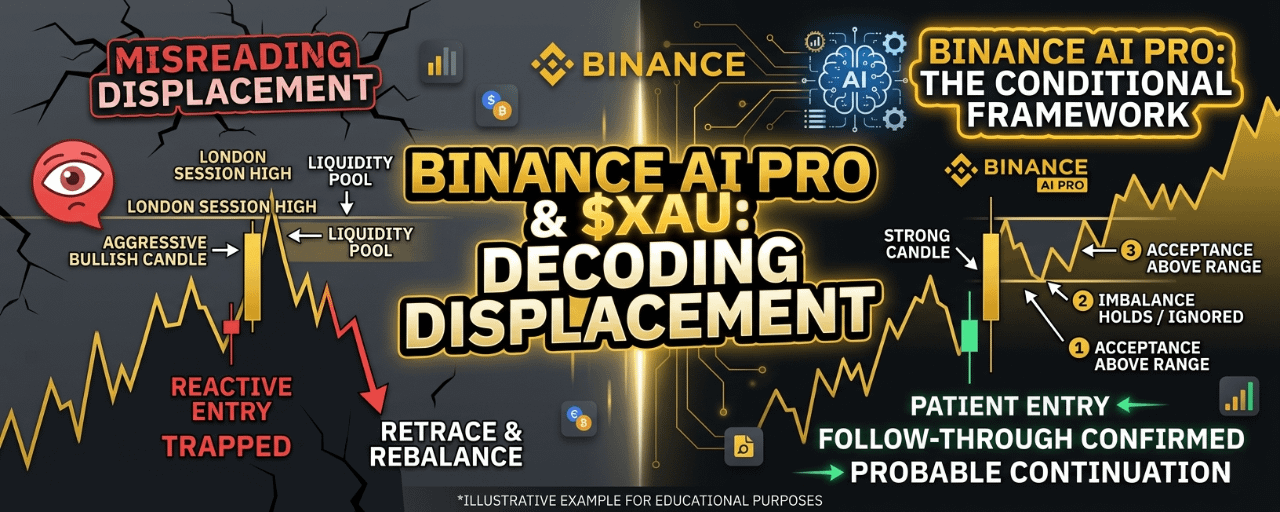 Binance AI Pro becomes meaningful when it is used to dissect one specific weakness most traders have on $XAU , misreading displacement. Strong candles are often interpreted as confirmation, but in gold, displacement without context is frequently just liquidity engineering.