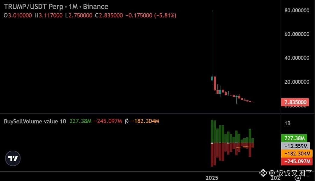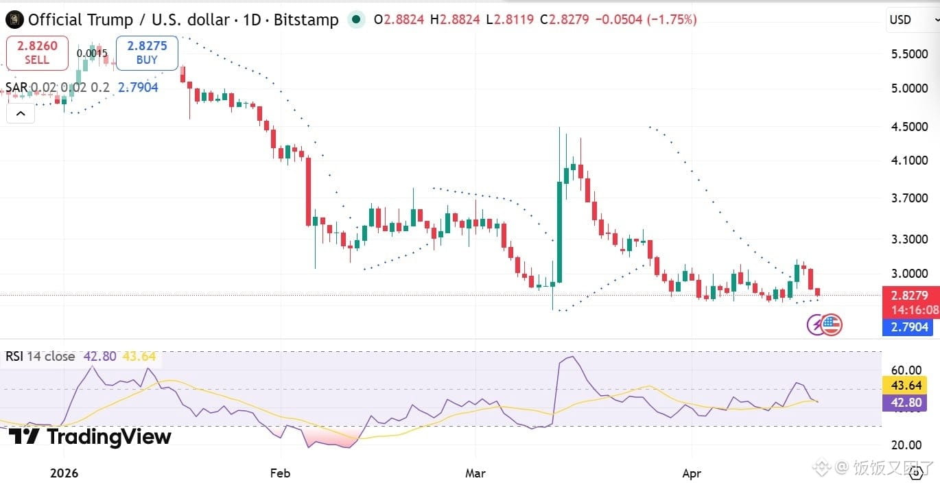 最近,Official Trump(#TRUMP )这个#MEME 币的走势有点难看,价格一路走弱,从3美元一线支撑跌破后,最低已经来到2.8美元附近。