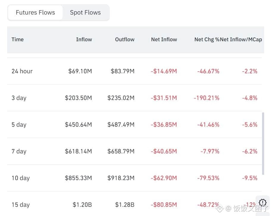 过去三周,卖方成交持续占优,市场几乎没有出现明显的反转信号。无论是成交量结构还是净流量,都显示出一个很清晰的状态:抛售多,接盘少。