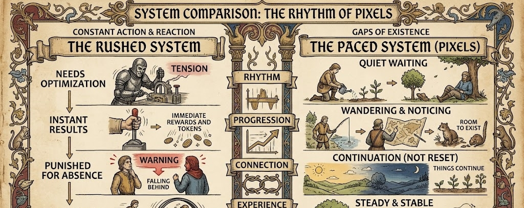 Niektóre systemy wydają się resetować zbyt szybko. Jakby nic nie pozostawało. Pixels trzyma się rzeczy wystarczająco długo, aby wydawały się realne.