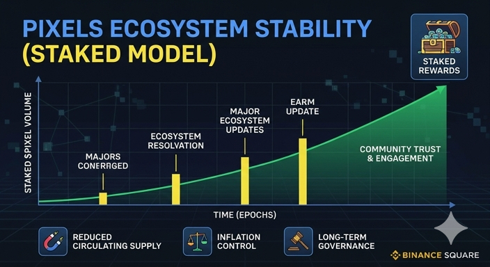 Ключ до успіху проєкту лежить у розумному розподілі ресурсів. Впровадження системи Staked дозволило приборкати інфляцію, яка зазвичай вбиває блокчейн-ігри. Коли користувачі взаємодіють з екосистемою @Pixels, вони не просто витрачають час — вони стають частиною капіталізації проєкту.