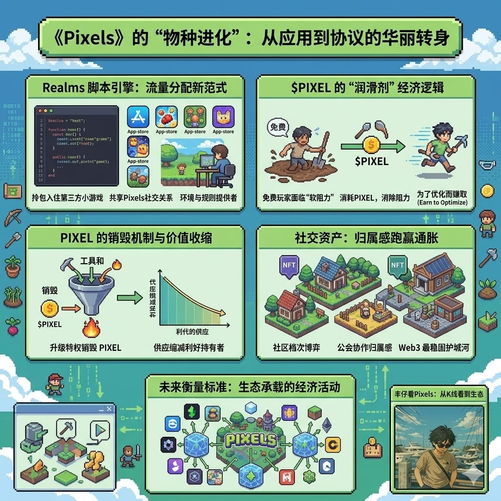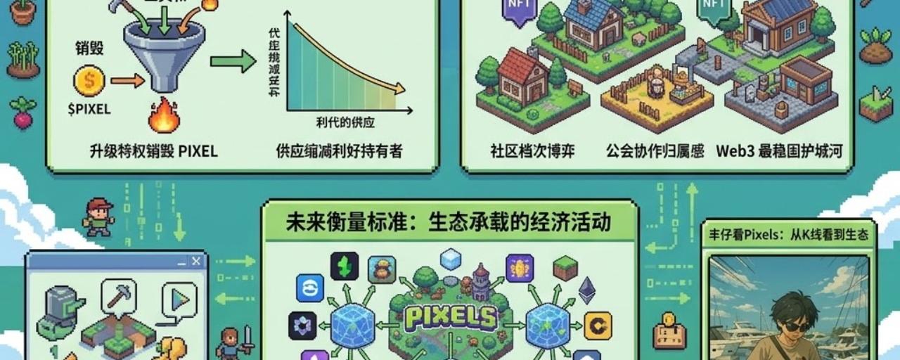 聊到 $PIXEL 很多人关注的是奖励,丰仔更关注的是“消耗”。在 Pixels 的设计里,免费玩家确实能玩,但会感觉到一种无处不在的“软阻力”。基础工具效率低、共享土地要抽税、等待时间长。这些不是为了拦住你,而是为了引导你。想要效率?消耗 PIXEL;想要特权?持有 NFT。这种“Earn to Optimize(为了优化而赚取)”的循环,让 PIXEL 变成了一种生存必须的生产资料,而不是单纯的治理代币。更聪明的是它的销毁机制。升级工具、提升土地,每一笔 PIXEL 在缩减供应。只要需求侧:开发者进入、玩家追求效率这些还在增长,这种收缩就是对持有者最硬核的利好。