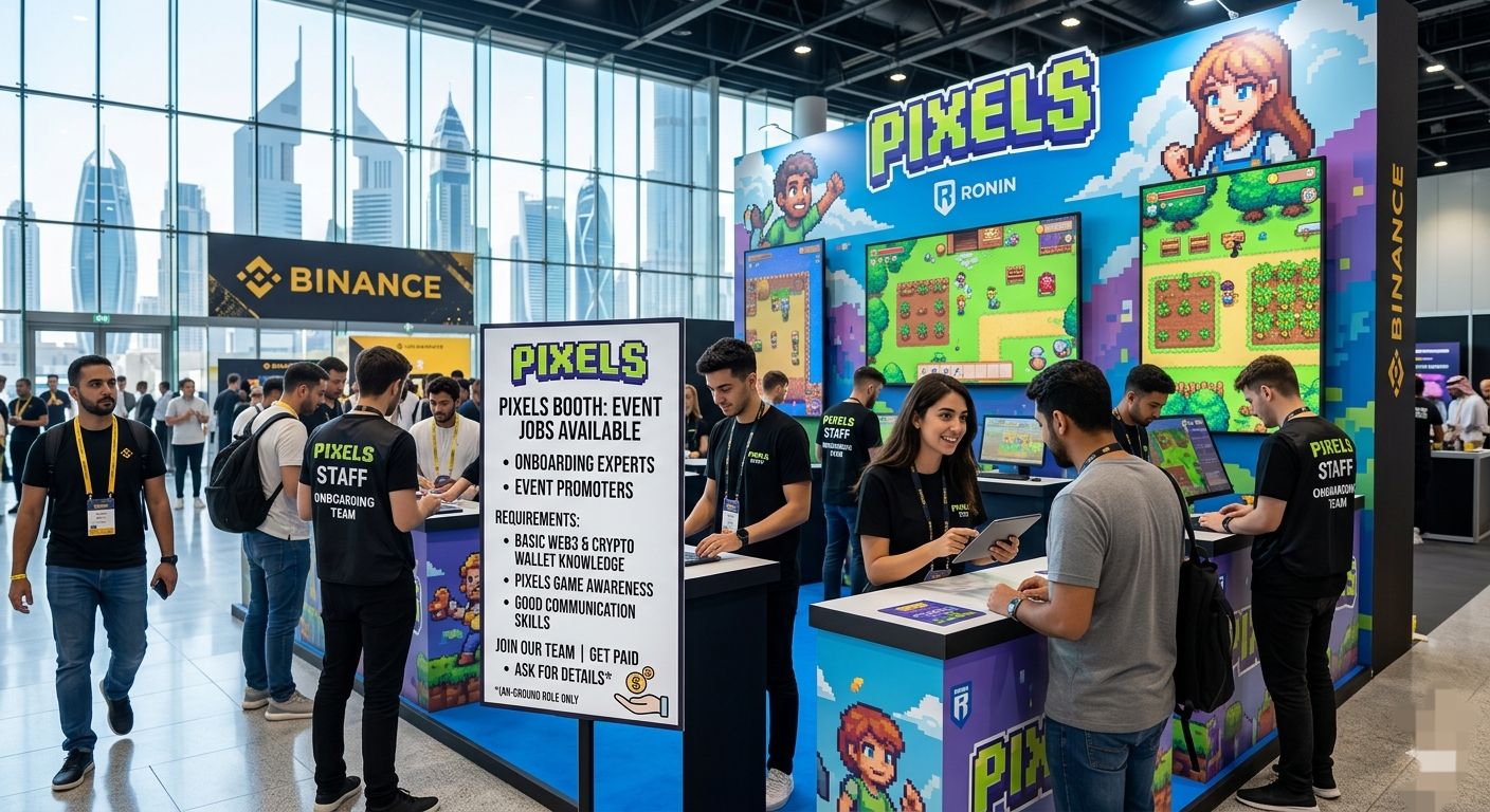 Dubai has truly become a global hub for web3 and crypto and the recent binance event proved this once again while major crypto projects from around the world participated in this mega event the biggest buzz was seen on the gaming side where the pixels game has its official booth pixels is robin network largest and most popular web3 farming game today and they kept their booth completely practical and interactive visitors had the opportunity to play the gamer directly and test new updates live the pixels team was the on ground presence directly interacting with users and educating them about the game which made the crowd at the booth very organic and genuine The most useful thing about this event is that such premium booths are not just for brand awareness or show but also create real on ground paid jobs At this Binance event direct paid opportunities were created for event promoters and onboarding experts at the Pixels booth The main task of staff in this paid role was to attract event visitors to the booth explain the basic gameplay and farming mechanics of Pixels and most importantly successfully connect new users Web3 wallets This was a proper professionally paid role where on ground staff and promoters were paid fairly well for their work and daily shifts The best part about this job was that it didn't require a major technical or IT degree Anyone with a basic understanding of Web3 a grasp of using crypto wallets and a little knowledge of the Pixels game could easily qualify for this role You just needed to have a good way of communicating with people so that new users would be convinced to try the game In a way this was direct marketing and user acquisition work for which you were getting direct payment