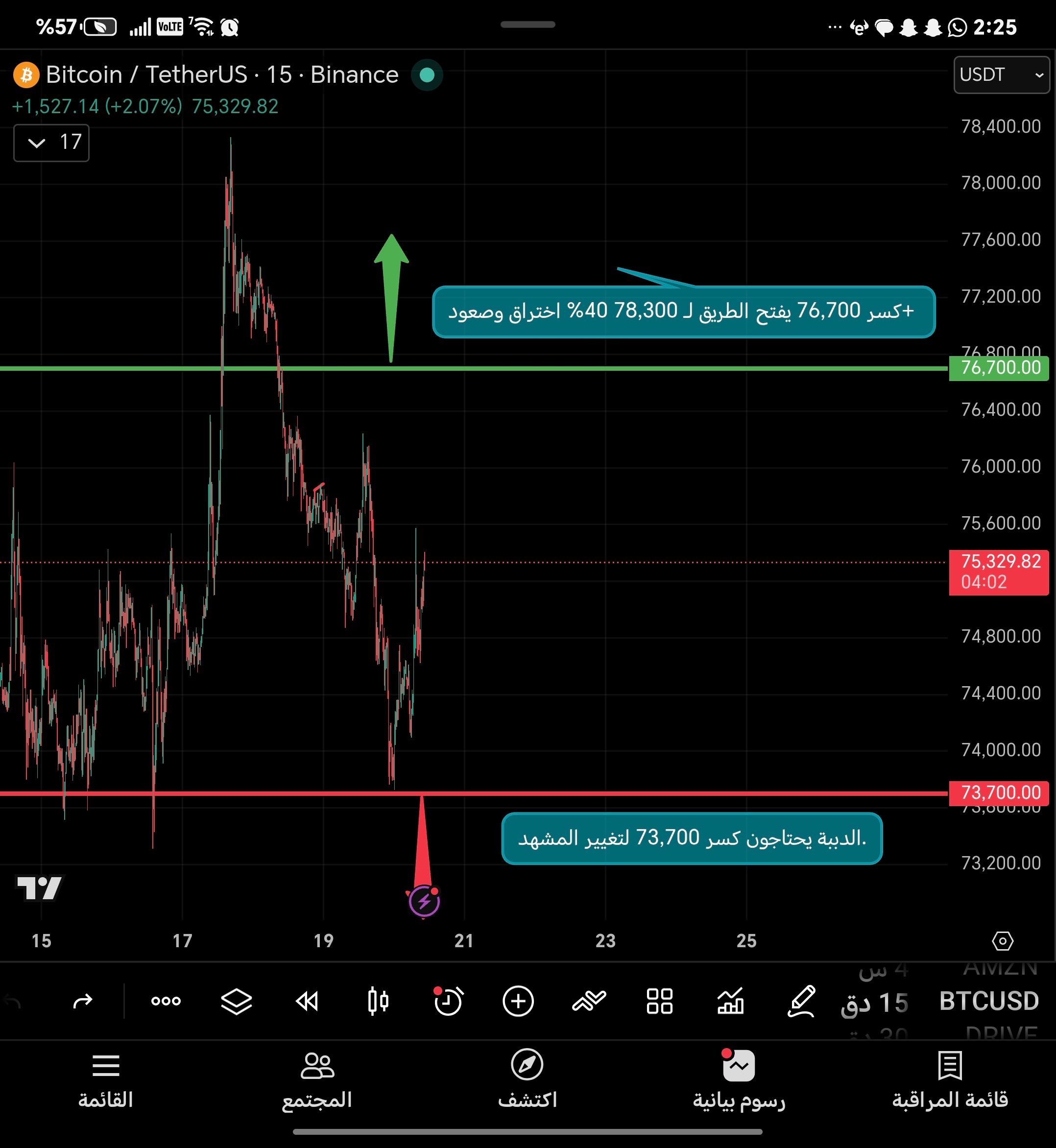 - شراء: عند الارتداد من 74,000 - 74,500 (منطقة ذهبية)